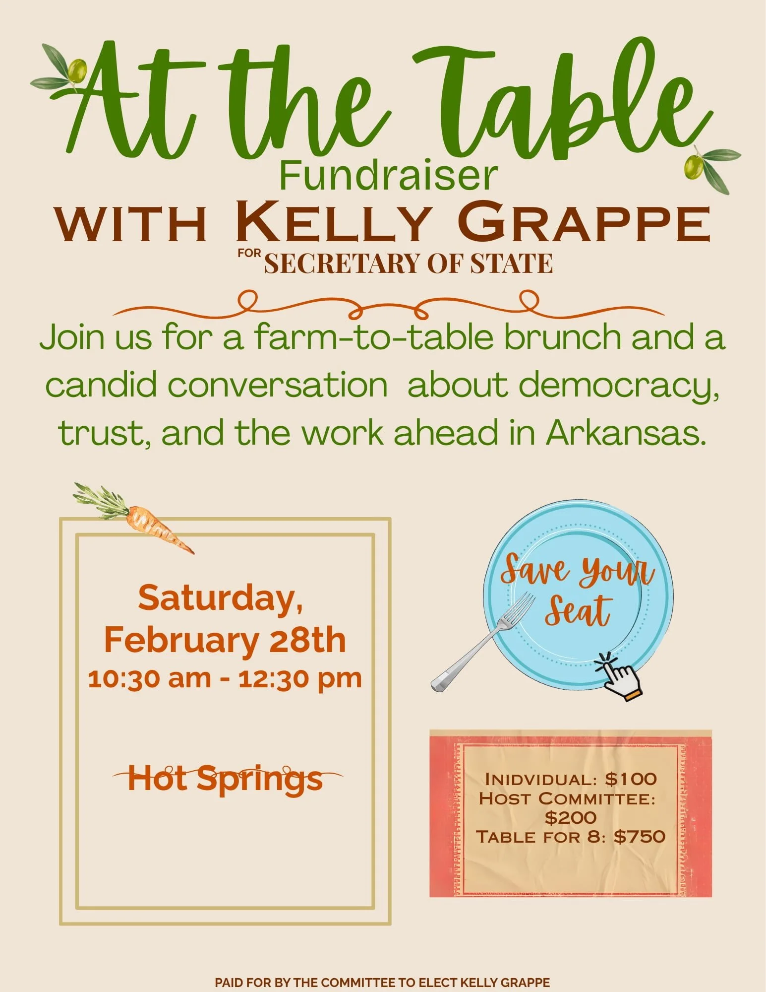 At the Table is not a rally or scripted program. It's time together - to talk honestly about where Arkansas is and what responsible leadership looks like in this moment. This event brings together supporters from Hot Springs and the greater Garland County area for good, locally sourced food and thoughtful discussion in a relaxed but purposeful setting.